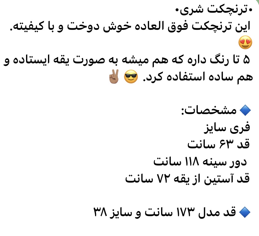 ✅ اگر به دنبال یک کت شیک، کلاسیک و در عین حال کاربردی هستید، ترنچ کت شری میتواند همان انتخابی باشد که کمد لباس شما نیاز دارد.