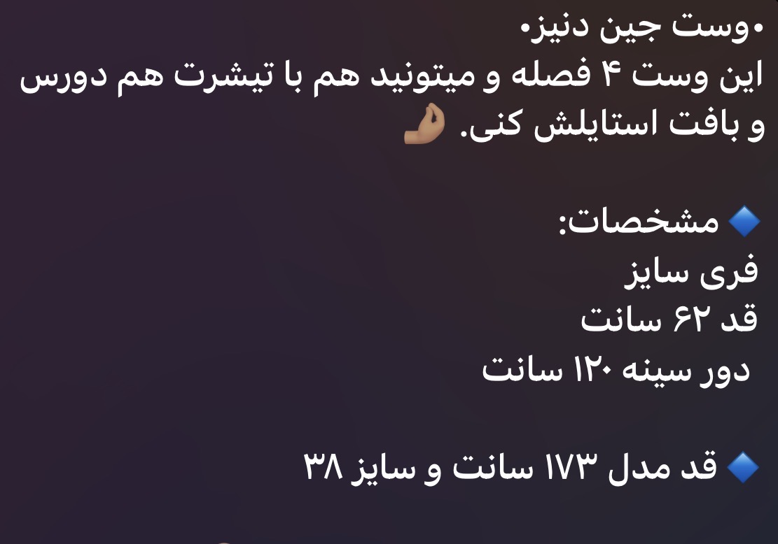 وست جین دنیز یکی از جذابترین انتخابها برای استایلهای کژوال و ترندی است که همواره طرفداران خاص خود را دارد. این محصول با پارچه جین ترک باکیفیت طراحی شده و به دلیل دوخت محکم و جزئیات شیک، بهراحتی میتواند به آیتمی ماندگار در کمد لباس شما تبدیل شود.